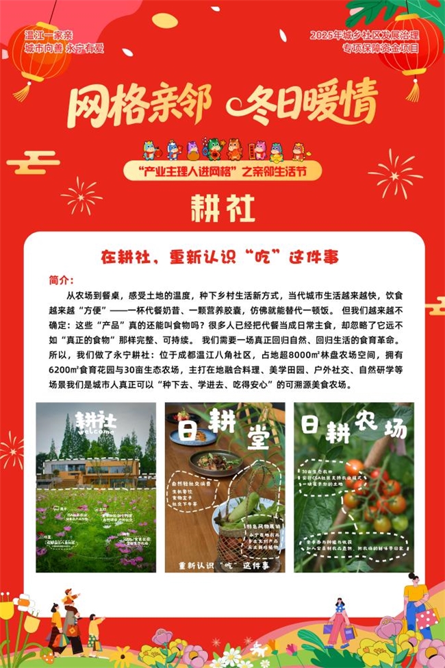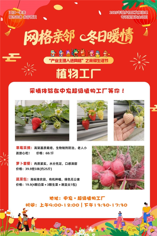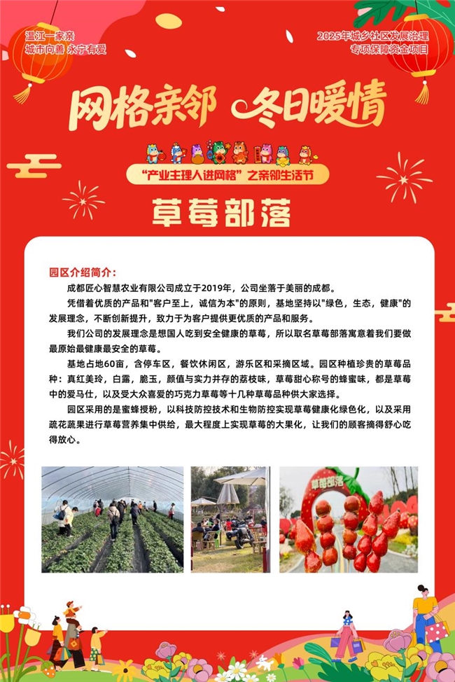 在温江区永宁街道八角社区,一场以“微网精治”为纽带的社区治理创新实践正悄然开花结果。依托2025年度“微网精治·效能提升”微网实格项目,八角社区积极探索“产业主理人进网格”模式,积极链接如中农超级植物工厂、天之牧、草莓部落、犍小茉等社区内丰富的手工艺人、林盘农户、社区企业产业资源,有效转化为网格治理的共建力量。一年来,三次紧扣季节、贴近民心的主题活动,不仅让居民收获了实实在在的幸福感,更绘就了一幅“网格扎根院落、服务温暖民心、邻里互助共生”的社区治理新图景。